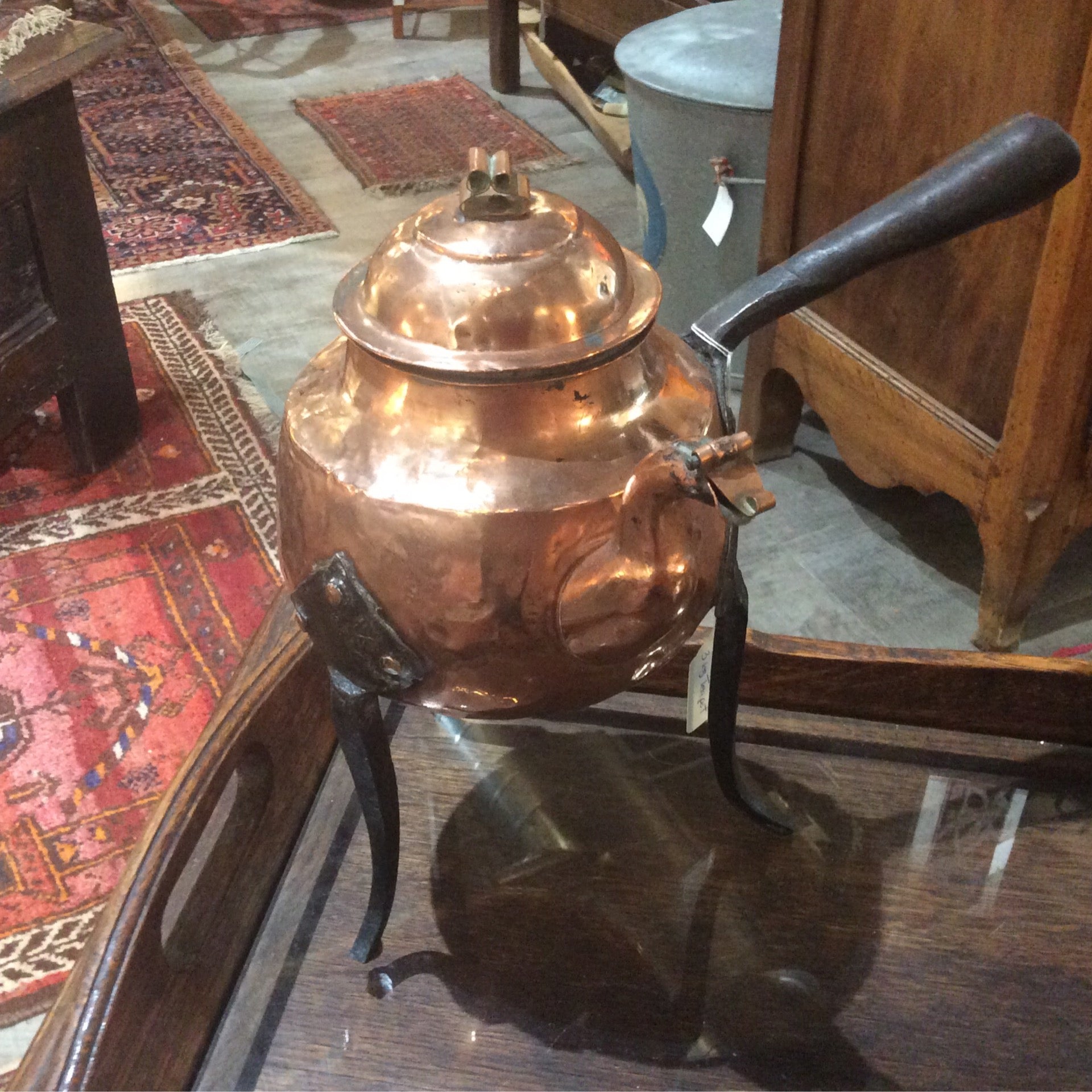 This wonderfull 3 legged Copper Teapot is an exquisite piece, full of vintage charm and sophistication. Handcrafted with a solid copper exterior and a sleek iron base and handle, it will add a touch of class to any tea-drinking experience. Clean inside and 11" tall, this piece is sure to be treasured by all.