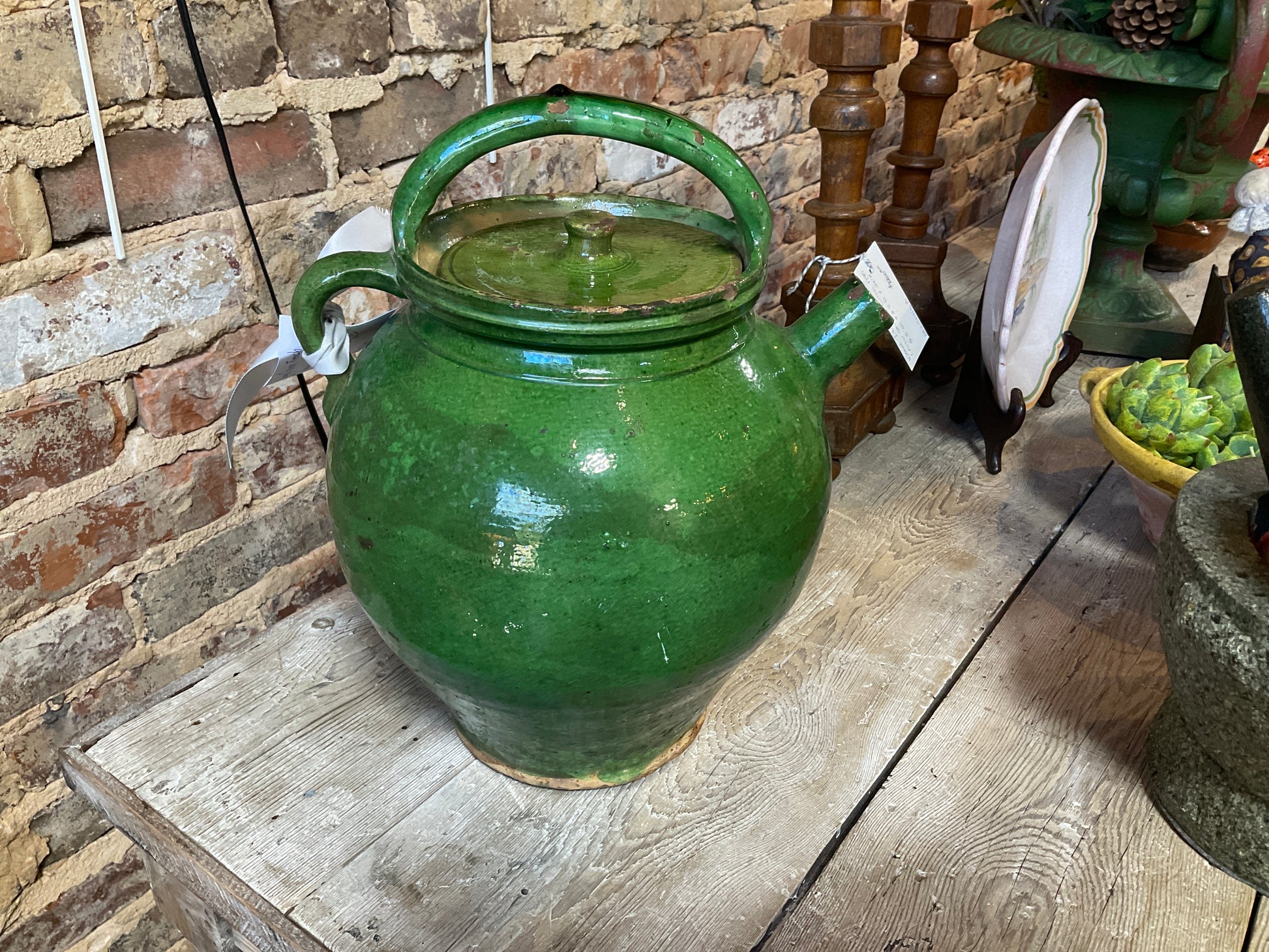 Large green French gargoulette (pitcher) with lid. 12” tall.
