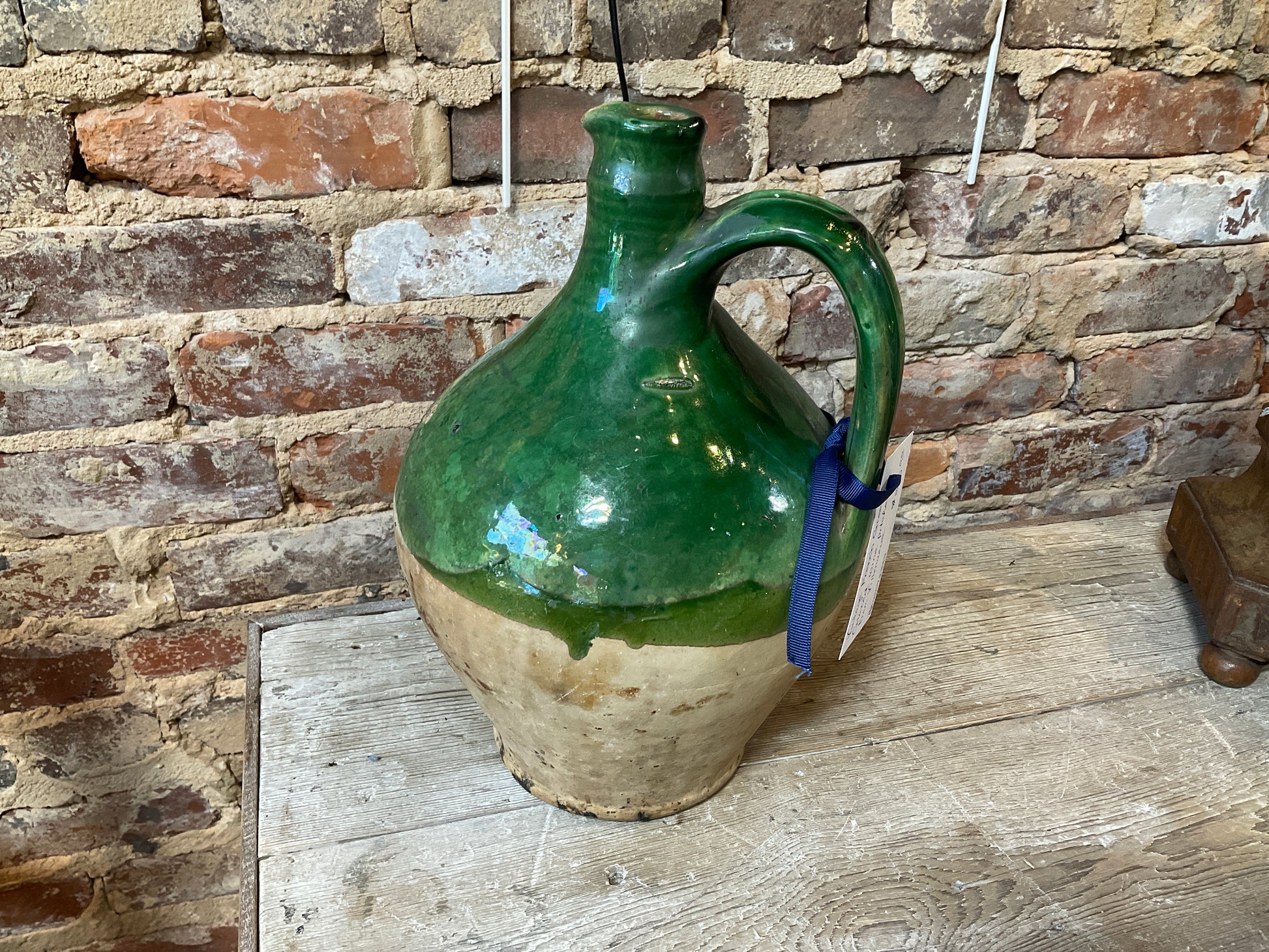 Vintage French green glazed wine pitcher from Villenueve. 12” tall.